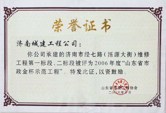 济南市经七路(泺源大街)维修工程第一、二标段被评为2006年度山东省市政金杯树模工程