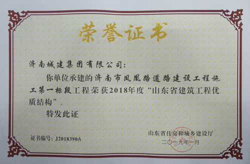 济南市凤凰路蹊径建设工程施工第一标段工被评为2018年度“山东省修建工程优质结构”