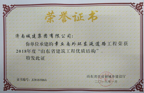章丘南外环东延蹊径工程被评为2018年度“山东省修建质量泰山杯工程”