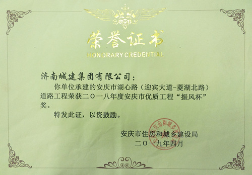 安庆市湖心路(迎宾大道-菱湖北路)蹊径工程被评为2018年度安庆市优质工程“振风杯”奖