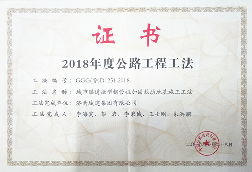 集团“都会隧道微型钢管桩加固软弱地基施工工法”被评为2018年度公路工程工法