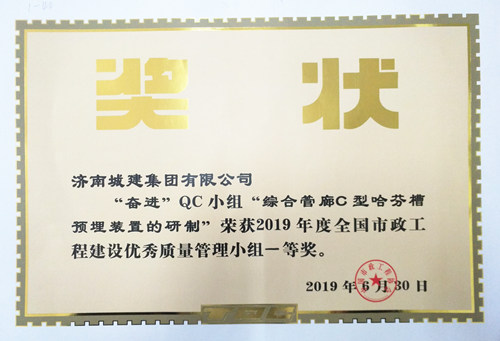 集团“奋进”QC小《综合管廊C型哈芬槽预埋装置的研制》荣获“2019年度天下市政工程建设优异质量治理小组一等奖”