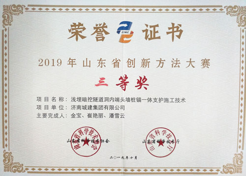 集团《浅埋暗挖道洞内端头墙桩锚一体支护施工手艺》荣获“2019年度山东省立异要领大赛三等奖”